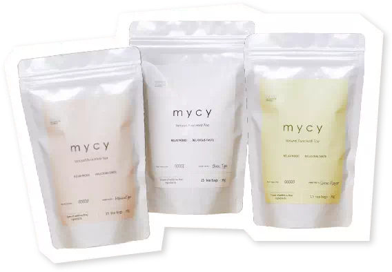 mycy第1段はセルフケアハーブティー。代表含め、メンバーが毎月悩まされる女性の心身の不調を緩和できるように開発した、女性ホルモンをサポートするハーブティーです。